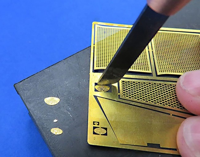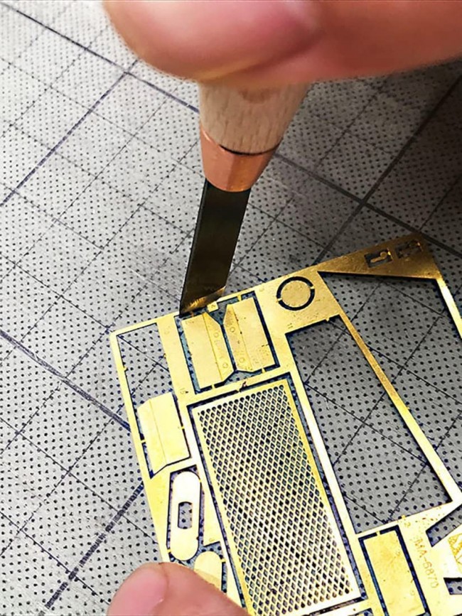 Knives, cutters, etc. This tool is useful for gate cutting of etching parts. The feature of this tool is the shape of the blade tip. The R shape makes it easy to apply force to push off and cleanly cut the targeted gate. The blade is made of Yasugi steel No. 2. The blade is made of Yasugi steel No. 2, which produces a sharp cutting edge. The double-edged blade is easy to use for both right- and left-handed users.
