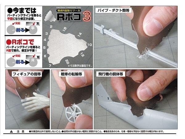 Upgraded version with improved accuracy! This R-Boko enables R-face machining and fine R-face line erasing, which has been difficult until now! R convex surface cutting can be selected and fine R chamfering can be performed. Saw craftsmen use 0.4mm-thick steel (steel plate) and apply fine cutting edges of 10 microns* on both sides of each R concave. The actual thickness is about 0.38 mm. (*10 microns is 1/100 of a millimeter) Eleven types of R concave surfaces are processed, allowing the user to select the R surface cutting process that best suits the object and smoothly chamfers fine corners. Truly craftsmanship! Material: High carbon special cutting steel Body thickness: approx. 0.38 mm Size: 1 side (approx.): 60 x 60 x 60 mm Surface treatment: 3.0 micron nickel plating Earl concave blade attachment: Saw craftsman's hand technique Blade attachment: 0.01mm on each side Use: Cutting of resins