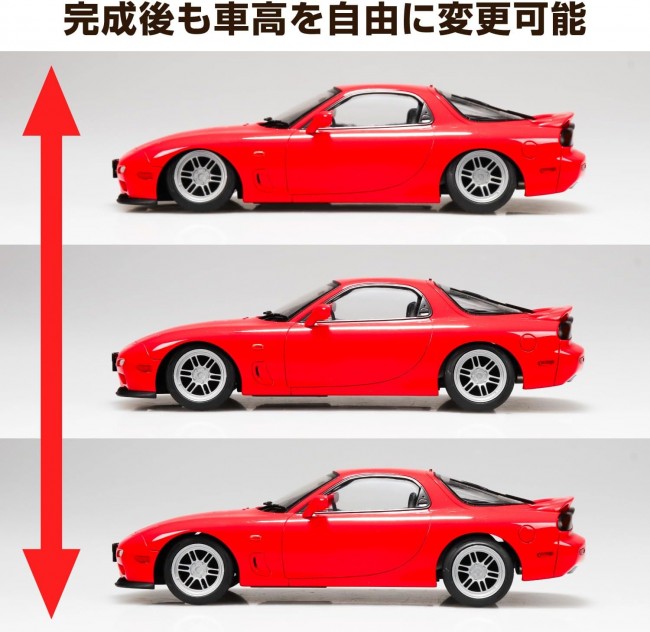 New Mechanism Chassis, Fourth Installment Arrives! The fourth installment in the Air Suspension Custom Series combines a popular sports car with a new mechanism chassis, allowing adjustment of ride height, camber angle, and steering angle even after assembly. This model is the 1991 FD3S RX-7. The steering links both sides, while ride height and camber angle can be freely adjusted independently for all four wheels. 【Product Features】 ・Dedicated chassis allows free adjustment of ride height/camber angle ・Front tires move left and right ・New wheels included: ENKEI RPF1 (17-inch)