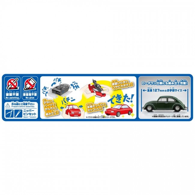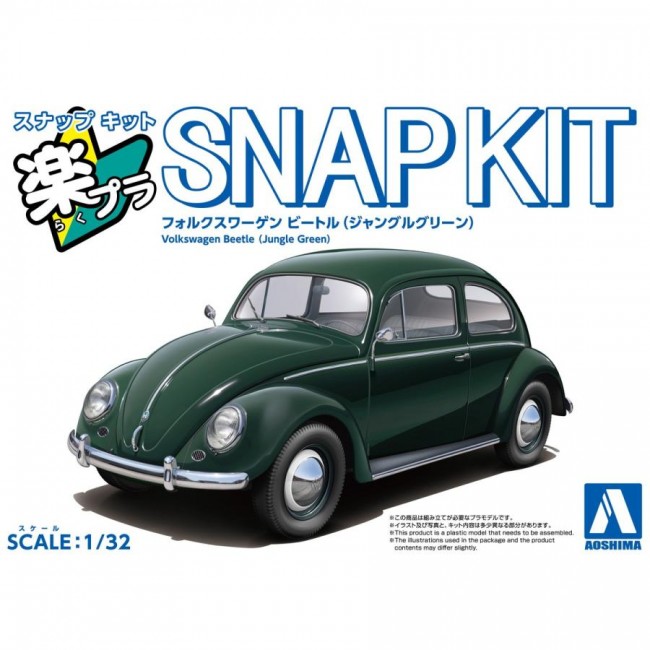 Plastic model [Scale] 1/32 ・Volkswagen's “Beetle” which started production in 1938 ・Reproduction of the model commonly known as the “Oval” ・Reasonable model with 32 parts [What is Rakurakupura Snap Kit?] ・No painting required By reproducing the body color by coloring the plastic material, painting is no longer required. The glossy body is also a highlight. ・No need for adhesives Adhesives are no longer necessary due to the use of a fastening system. ・High reproducibility with fewer parts. The kit has been simplified, but still achieves high reproducibility in 1/32 scale. Body color: No.20-JG Jungle Green.