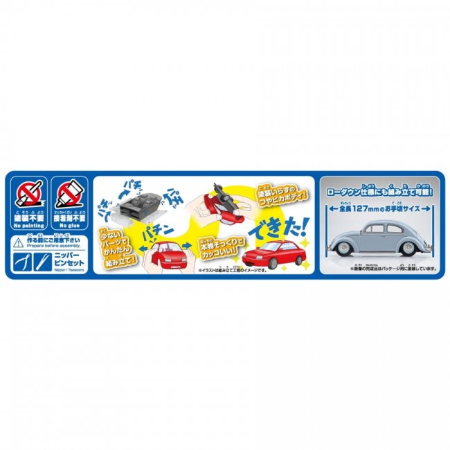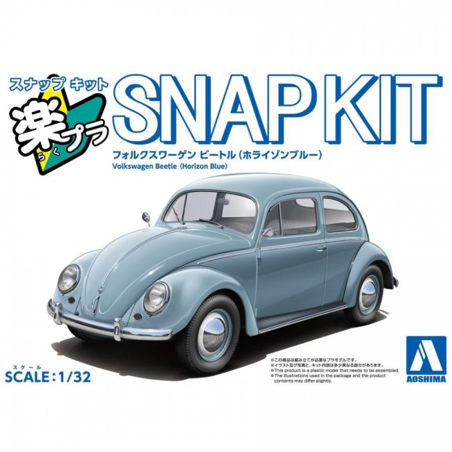 Plastic model [Scale] 1/32 ・The “Beetle” of Volkswagen which started production in 1938 ・Reproduction of the model commonly known as the “Oval” ・Reasonable model with 32 parts [What is Rakurakupura Snap Kit?] ・No painting required By reproducing the body color by coloring the plastic material, painting is no longer required. The glossy body is also a highlight. ・No need for adhesives Adhesives are no longer necessary due to the use of a fastening system. ・High reproducibility with fewer parts. The kit has been simplified, but still achieves high reproducibility in 1/32 scale. Body color: No.20-HB Horizon Blue