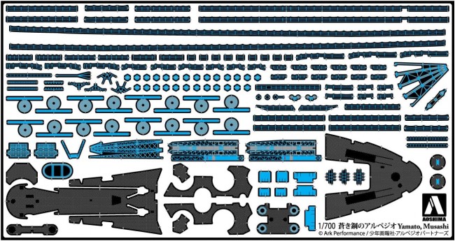 Super Battleship Musashi Yamato with greater precision! From “The Movie: Blue Steel Arpeggio - Ars Nova - Cadenza,” we are releasing detail-up parts that allow for a more precise reproduction of the Super Battleship Musashi Yamato from the Fog Fleet. ? Includes 2 etching parts ? Includes main gun metal barrel *The image is a prototype. The actual product may differ. *The product does not include the plastic model itself. *This product has the same contents as the “Fog Fleet Super Battleship Musashi Yamato Dedicated Detail-Up Parts” released by our company in 2016. [Plastic Model] Brand AOSHIMA Series Blue Steel Arpeggio -Ars Nova- Scale 1/700 (C) Ark Performance/Shonen Gahosha・Arpeggio Partners (From Aoshima Cultural Textbook website)