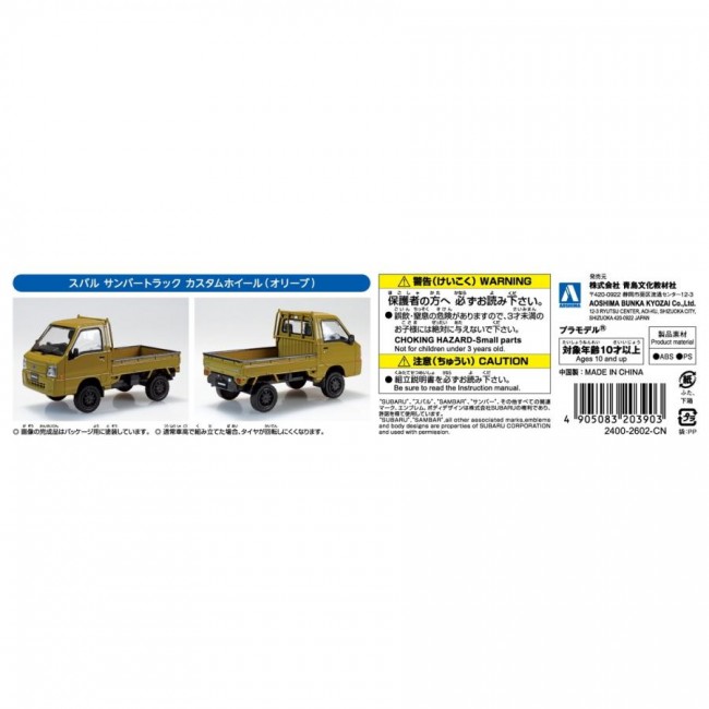 Even light trucks want to look stylish! <New Mold Added> The Subaru Sambar, famously known as the “Porsche of farm roads” for its rear-wheel drive, is now a realistic plastic model kit. This time, we're adding a custom wheel specification. It can be assembled with a choice of standard ride height. ・Easy-to-build model with 26 parts ・Decal reproduction for areas requiring color separation ・Optional assembly for standard ride height ・Body Color: No.05CU-OE Olive ・Wheel Color: Semi-Gloss Black ■No Painting Required The body color is achieved through plastic material coloring, eliminating the need for painting. The glossy body finish is a highlight. ■ No Adhesive Required The snap-fit construction eliminates the need for glue. ■ High Fidelity with Minimal Parts Achieves high fidelity at 1/32 scale despite kit simplification. ※Images show prototypes. Actual product may differ. ※This is a plastic model kit. Tools are required for assembly. ※Please note wheel colors vary by vehicle model. ※SUBARU Co., Ltd. Application Pending [Plastic Model] Brand AOSHIMA Series Rakupura Snap Kit No.05CU-OE Scale 1/32 (From Aoshima Bunka Kyozai website)