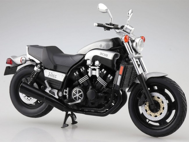 The famous street dragger, reappears in the finished motorcycle series! [Product Description] The Vmax, which was on sale for 22 years starting in 1985, is a famous bike that established a new genre of street dragger with its powerful engine and "V-boost system" that provides overwhelming acceleration performance. The Vmax has been reproduced in its full form and presence, including the V-4 twin-cam engine with a displacement of 1200cc, the characteristic air inlet covers, and the powerful dragger-style form. The frame and tank cover are made of die-cast metal, giving the model a high level of weight and texture. This is a finished model with excellent cost performance. We hope you will enjoy it. [Product Specifications] Complete painted model Steering wheel and rear suspension are movable. Material: Body / Die-cast, ABS, PS Tires/TPR Scale: 1/12 Size: approx. 190mm in length Display stand included Aoshima original development product The image is a prototype. It may differ from the actual product. Series Completed Motorcycle