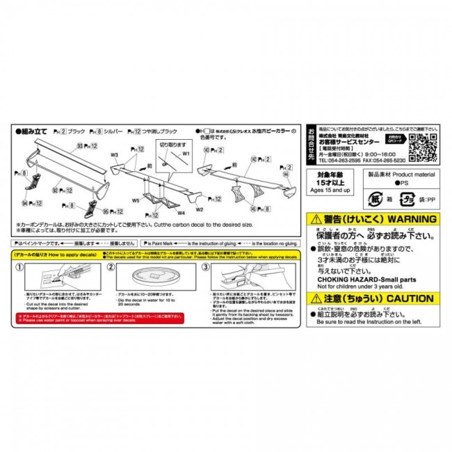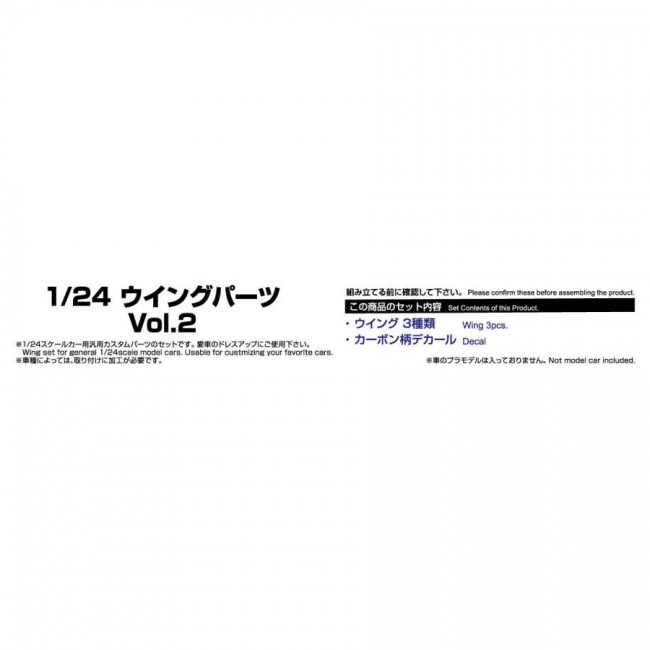 [Scale] 1/24 Make your car sportier! The highly versatile wing parts set will be added to The ☆ Tuned Parts. Includes 3 types of rear wings in each set. Includes carbon decals that can be attached anywhere you like. *Some modifications may be required when installing the wing.