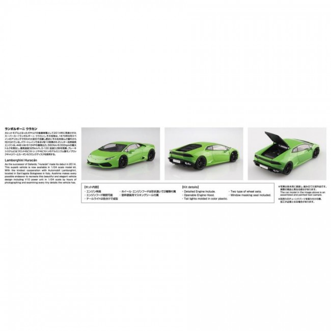 Plastic model [Scale] 1/24 The blockbuster supercar “Lamborghini Uracan” that surpasses the Gallardo The supercar “Lamborghini Auracan” was announced in 2014 as the successor to the Gallardo. The 5.2-liter V10 engine has been faithfully reproduced. Rear engine hood can be opened and closed even after assembly Tail lights are color-coded and molded Two types of wheels and engine hood are included. Window frame masking stickers included