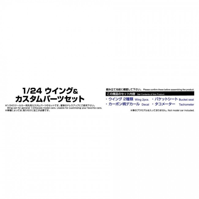 [Scale] 1/24 Make your car more sporty! Includes two types of rear wings, bucket seats and a large tachometer. Includes carbon decals that can be attached anywhere you like. *Please purchase the plastic model of your car separately. *Please purchase a plastic model of your car separately.