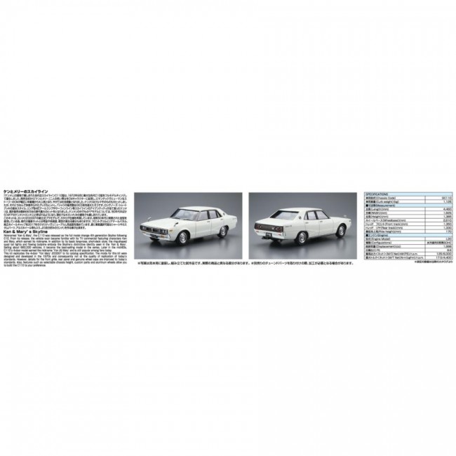 Plastic model [Scale] 1/24 Ken and Mary Skyline [Characteristics of the actual vehicle] The 4th generation Skyline C110 series, nicknamed Kenmeri, was born in September 1972 with a full model change of the great predecessor C10 series. From the beginning of its release, two young men and women, "Ken and Mary," were appointed as CM characters, and CMs with romantic and human stories became very popular from a wide range of age groups, and eventually became a social phenomenon. The car itself was a big hit for Kenmeri, but many goods made after that were also a hit, and the number of T-shirts sold exceeded 300,000. With all the basic styles of long nose and short deck, four-lamp tail lamp, surfing line, horizontal pointer meter and other skyline identities, Kenmeri has produced more than 670,000 units and became the biggest hit in history. Among Kenmeri, the 4-door model has been called "4-door Kenmeri-Yonmeri" since the mid-1980s, and as of 2021, it is also known as "Yonmeri". [Kit features] ● Assembled plastic model of Yonmeri 2000GT ● Reproduce the catalog specifications ● Uses a mold developed in the 1950s ● The front grille, rear tail panel, and genuine hubcaps have been renewed with 2017 quality to improve the degree of perfection. ● Chassis and custom parts with selectable vehicle height ● Aluminum wheels, etc.