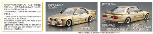 Plastic model [Scale] 1/24 White Syndrome is not the only high soker. The ☆ High Socar series is a modified car that is about “more than a model car and less than Grachan”, and is a series that will be developed based on a high soker of a slightly newer age than the Grachan series. No.02 is Y31 Cedric / Gloria. Introducing the Konig-style blister style that was popular at the end of the bubble. ● Cedric / Gloria selection formula ● New decal ● Blister full aero ● Vehicle height selection type ● Fender trim seal ● Aluminum license plate ● 14 inch shadow spokes ● Uses 14-inch hip tires ● Body molding color: White