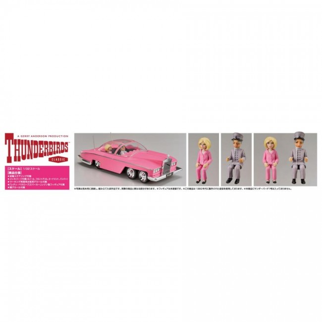Plastic Model Feel the nostalgia. The classic "Thunderbirds" of yesteryear. 1/32 "Lady Penelope" and "Parker" new resin figures included. Eye decals included Front wheel steering wheel is movable. Chrome parts included (wheels, front grille, ornament, bumper) Water transfer decals for reproduction of markings included. This product uses molds made in the 1960s. The figure is unpainted.