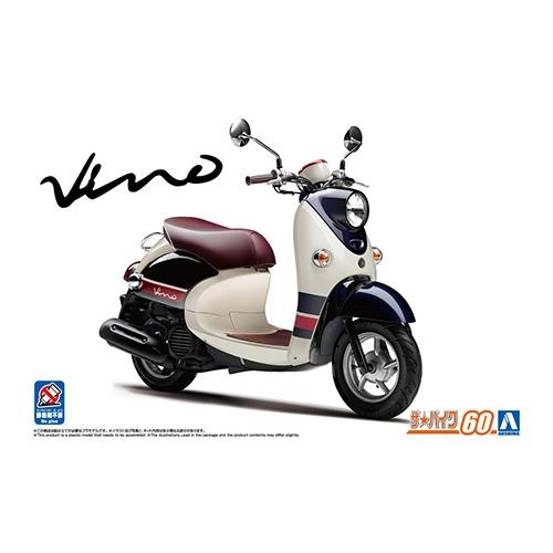 Too cute scooter “Yamaha Vino The popular moped scooter “Vino” with retro pop style will be released as a 1/12 scale plastic model. The Vino can be easily assembled with no glue required. The parts are colored in accordance with the actual model, so you can build a beautiful finished model without painting. Some parts require decals and painting. The image is a prototype. The image is a prototype and may differ from the actual product. This product is a plastic model kit. Tools are required for assembly. Under the supervision of Yamaha Motor Co. [Plastic model]. Brand AOSHIMA Series The Bike No.60 Scale 1/12 (From Aoshima Bunka Kyozai website)