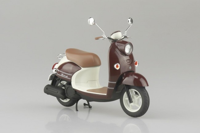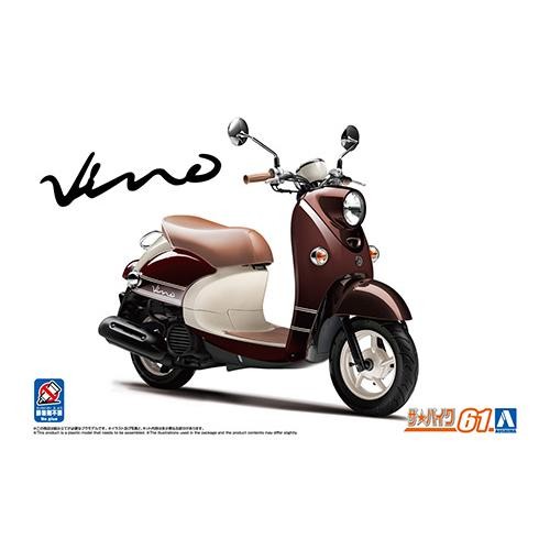 Too cute scooter “Yamaha Vino The popular moped scooter “Vino” with retro pop style will be released as a 1/12 scale plastic model. The Vino can be easily assembled with no glue required. The parts are colored in accordance with the actual model, so you can build a beautiful finished model without painting. Some parts require decals and painting. The image is a prototype. The image is a prototype and may differ from the actual product. This product is a plastic model kit. Tools are required for assembly. Under the supervision of Yamaha Motor Co. [Plastic model]. Brand AOSHIMA Series The Bike No.61 Scale 1/12 (From Aoshima Bunka Kyozai website)