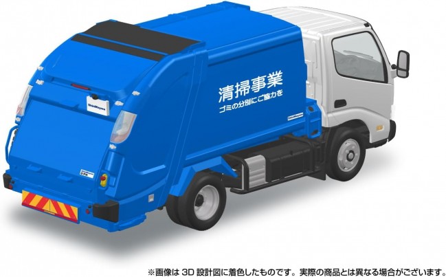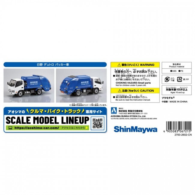 Japan's top-selling garbage truck! Rakupura's “Working Vehicles” series welcomes the Packer Truck (Garbage Truck). The cab is modeled after the Hino Dutro, while the packer unit is based on Shinmeiwa Industries' G-PX. The lower body frame equipment is also realistically reproduced. Features a low part count, no painting required, no glue needed. A plastic model kit enjoyable for everyone from children to seniors. ・Easy-to-build model with 47 parts ・Decal sheets provide color separation where needed ・Can be assembled with lift-up functionality 【What is Rakupura Snap Kit?】 ■No Painting Required Body color is achieved through plastic material coloring, eliminating the need for paint. The glossy body finish is a key feature. ■ No Glue Required The snap-fit design eliminates the need for adhesive. ■ High Fidelity with Few Parts Simplified kit design achieves high fidelity at 1/32 scale. 【Bonus Included Only with First Production Run】(Bonus may not be included even with early orders due to shipping sequence.) Connectable! Diorama Paper Craft ※Image shows a colored 3D design diagram. Actual product may differ. ※This is a plastic model kit. Tools are required for assembly. ※Under supervision of Hino Motors, Ltd. and ShinMaywa Industries, Ltd. [Plastic Model] Brand AOSHIMA Series Rakupura Snap Kit No.25-PK Scale 1/32 (From Aoshima Bunka Kyozai website)