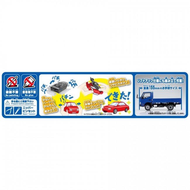──Hino's 2-ton truck Rakupura's first 2-ton truck, the Hino Dutro low-bed flatbed truck, is now available. Not only the body shape, but also the lower frame of the body has been realistically reproduced. With a reduced number of parts, no painting or glue is required. This plastic model kit can be enjoyed by both children and adults. ・Easy-to-assemble model with 35 parts ・Parts that require painting are reproduced with stickers 【What is Rakuraku Plastic Snap Kit?】 ? No painting required: The body color is reproduced using colored plastic material, eliminating the need for painting. The glossy body is also a highlight. ? No glue required: The snap-fit design eliminates the need for glue. ? Affordable price: The kit's simplified design and 1/32 scale achieve an affordable price. Scale: 1/32 Body color: No.23-BE Blue *The image is a colored 3D design drawing. The actual product may differ.