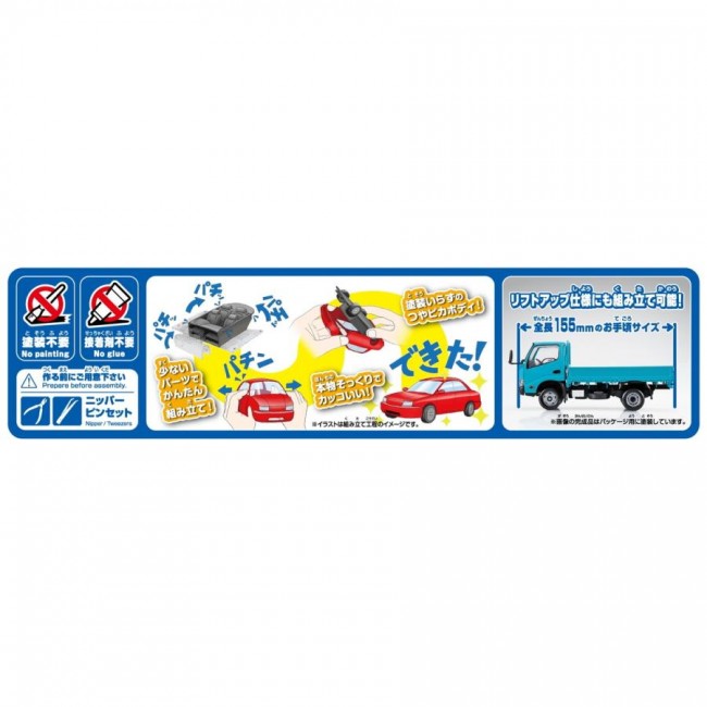 ──Hino's 2-ton truck Rakupura's first 2-ton truck, the Hino Dutro low-bed flatbed truck, is now available. Not only the body shape, but also the lower frame of the body has been realistically reproduced. With a reduced number of parts, no painting or glue is required. This plastic model kit can be enjoyed by both children and adults. ・Easy-to-assemble model with 35 parts ・Parts that require painting are reproduced with stickers 【What is Rakuraku Plastic Snap Kit?】 ? No painting required: The body color is reproduced using colored plastic material, eliminating the need for painting. The glossy body is also a highlight. ? No glue required: The snap-fit design eliminates the need for glue. ? Affordable price: The kit's simplified design and 1/32 scale achieve an affordable price. Scale: 1/32 Body color: No.23-TE Turquoise *The image is a colored 3D design drawing. The actual product may differ.