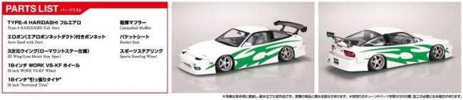 The original overhang full aero! The original 180SX Bai! TYPE-4 Full Aero 3D Wing (New standard mounting stay) New cannonball muffler New lowered suspension New 18-inch WORK VS-KF wheels New 18-inch WORK VS-KF wheels Bucket seats and sports steering wheel included New decals included Window frame paint stickers included Body: PS Tires: Rubber *The image is a prototype painted and assembled for sample purposes. It may differ from the actual product. *Adhesives for plastic models are required for assembly. *Under the supervision of Nissan Motor Co. [Plastic model] Brand AOSHIMA Series The Tuned Car No.98 Scale 1/24 (From Aoshima Bunka Kyozai website)