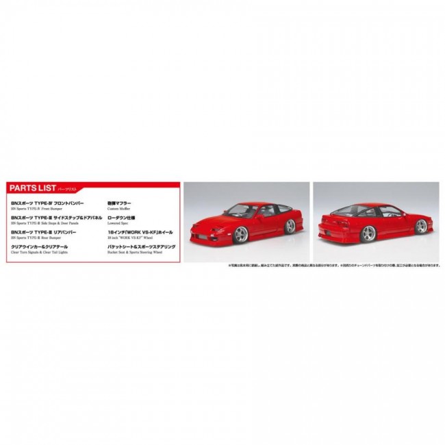 Plastic Model [Scale] 1/24 The second installment of the 180SX drift car style! [New Mold] The 180SX BN Sports specification tuned car is now available! The full aero kit is the same, but Ver. 1 of No. 99 comes with VS-KF wheels and fully clear molded lights! Ver.1 combines the BN Sport full aero kit, bullet muffler, 18-inch WORK VS-KF wheels with ultra-low-profile tires, and lowered suspension for a JDM-style look. The fully clear-molded lighting components are a key feature. New decals and window frame stickers are included, allowing you to enjoy meticulous attention to detail. 【Product Features】 ・TYPE-IV Front Bumper ? TYPE-III Side Steps & Door Panels ? TYPE-III Rear Bumper ? Clear-molded Turn Signals & Tail/Stop Lights ? New Bullet Muffler ? Lowered Suspension ? 18-inch WORK VS-KF Wheels ? 18-inch Extreme Tires ? Bucket Seats & Sports Steering Wheel Included ? New Decals Included ? Window Frame Painting Stickers Included