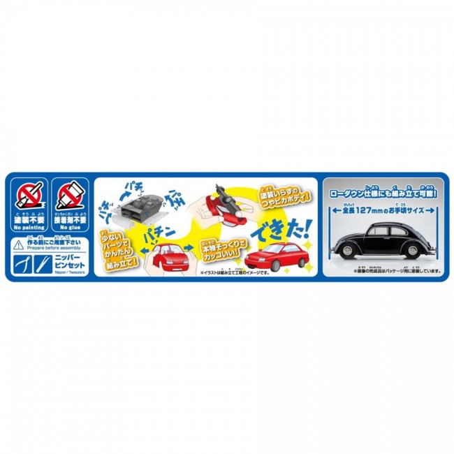 A car loved around the world Model of the generation of the best-selling car called “Oval” from 1955, which was loved all over the world for about 70 years. ■Modeled with only 32 parts. Body color: Black ■No painting required The body color is reproduced by coloring the plastic material, eliminating the need for painting. The glossy body is also a highlight. ■No adhesive required By adopting the fit-in type, no glue is now unnecessary. High reproducibility with fewer parts High reproducibility was achieved in 1/32 scale while simplifying the kit. *The image is a colored version of the 3D blueprint. They may differ from the actual product. Trademarks, design patents and copyrights are used with the approval of the owner Volkswagen AG. [Plastic model]. Brand AOSHIMA Series Rakurakupura Snap Kit No.20-BK Scale 1/32 Special offer only for the first production run. Connecting! Diorama Paper Craft (From Aoshima Bunka Kyozai website)