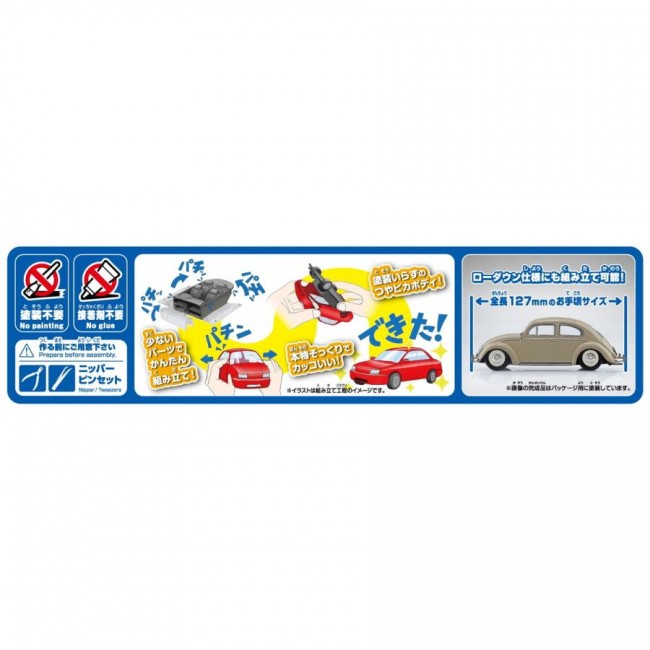 A car loved around the world Model of the generation of the best-selling car called “Oval” from 1955, which was loved all over the world for about 70 years. ■Modeled with only 32 parts. Body color: Light beige ■No painting required By reproducing the body color by coloring the plastic material, painting is no longer required. The glossy body is also a highlight. ■No adhesive required By adopting the fit-in type, glue is no longer necessary. High reproducibility with fewer parts High reproducibility was achieved in 1/32 scale while simplifying the kit. *The image is a colored version of the 3D blueprint. They may differ from the actual product. Trademarks, design patents and copyrights are used with the approval of the owner Volkswagen AG. [Plastic model]. Brand AOSHIMA Series Rakurakupura Snap Kit No.20-LB Scale 1/32 The bonus included only in the first production run. Connecting! Diorama Paper Craft (From Aoshima Bunka Kyozai website)