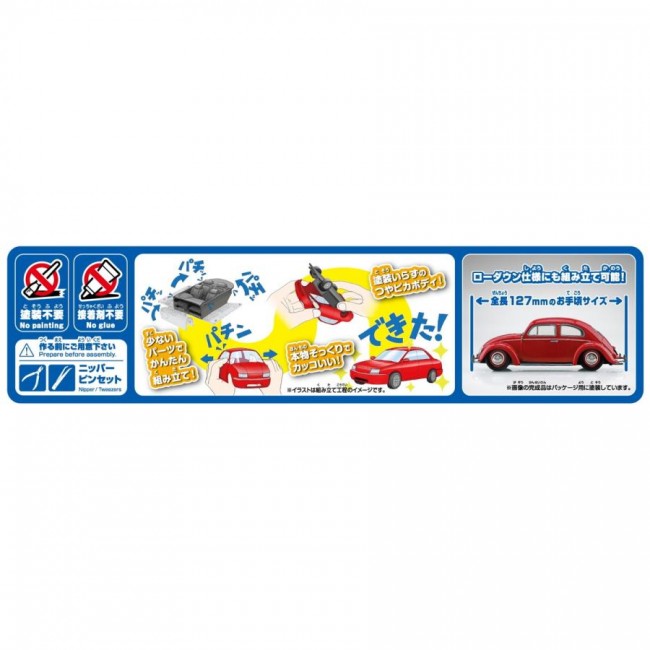 A car loved around the world Model of the generation of the best-selling car called “Oval” from 1955, which was loved all over the world for about 70 years. ■Modeled with only 32 parts. Body color: Ruby Red ■No painting required By reproducing the body color by coloring the plastic material, painting is no longer required. The glossy body is also a highlight. ■No adhesive required By adopting the fit-in type, no glue is now unnecessary. High reproducibility with fewer parts High reproducibility was achieved in 1/32 scale while simplifying the kit. *The image is a colored version of the 3D blueprint. They may differ from the actual product. Trademarks, design patents and copyrights are used with the approval of the owner Volkswagen AG. [Plastic model]. Brand AOSHIMA Series Rakurakupura Snap Kit No.20-RR Scale 1/32 Special offer only for the first production run. Connecting! Diorama Paper Craft (From Aoshima Bunka Kyozai website)