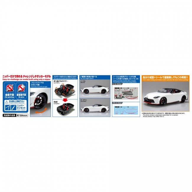 Plastic model [Scale] 1/24 [Size] Length: approx. 184mm Raku-Pla Snap Car Vol.6 For everyone who wants to challenge car modeling! The “NISMO specification” from the FAIRLADY Z is here! [Product Description] The RZ34 FAIRLADY Z NISMO is now available in Aoshima's new “Raku-Pla Snap Car” series. For those who want to build a plastic model of a car but do not want to make mistakes, no glue is used and no painting is required. The number of parts has been reduced, and the hurdle for building plastic models has been lowered dramatically. Of course, you can also paint the model in earnest! - No glue required to assemble - No painting required due to color-coded molding and stickers - Stickers and water transfer decals included - High reproducibility with only a few parts - Two different ride heights can be selected - Steering wheel can be cut off. *Please prepare tools such as nippers to separate parts from the runner.