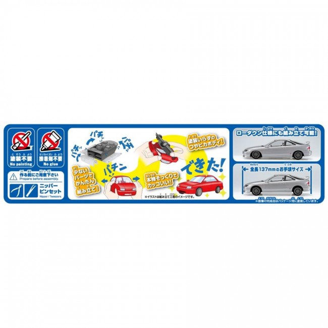 Plastic Model Kit [Scale] 1/32 Next R. 98 Spec now available. [Completely new mold] We have created a kit based on the late 1998 model of the Honda Integra Type R coupe, commonly known as the 98 Spec, which is a hot model equipped with VTEC. The number of parts has been reduced, and no painting or glue is required. This plastic model kit can be enjoyed by both children and adults. 【Product Features】 ? 28-part easy-to-assemble model ? 16-inch wheels ? Assembled even with a lowered suspension ? Painted areas are reproduced with stickers 【What is the Rakuraku Snap Kit?】 ? No painting required By reproducing the body color through the coloring of the plastic material, painting is no longer necessary. The glossy body is also a highlight. ? No glue required By adopting a snap-fit design, glue is no longer needed. ? High reproduction accuracy with fewer parts While simplifying the kit, it achieves high reproduction accuracy at 1/32 scale. ※This product is a plastic model kit. Tools are required for assembly.