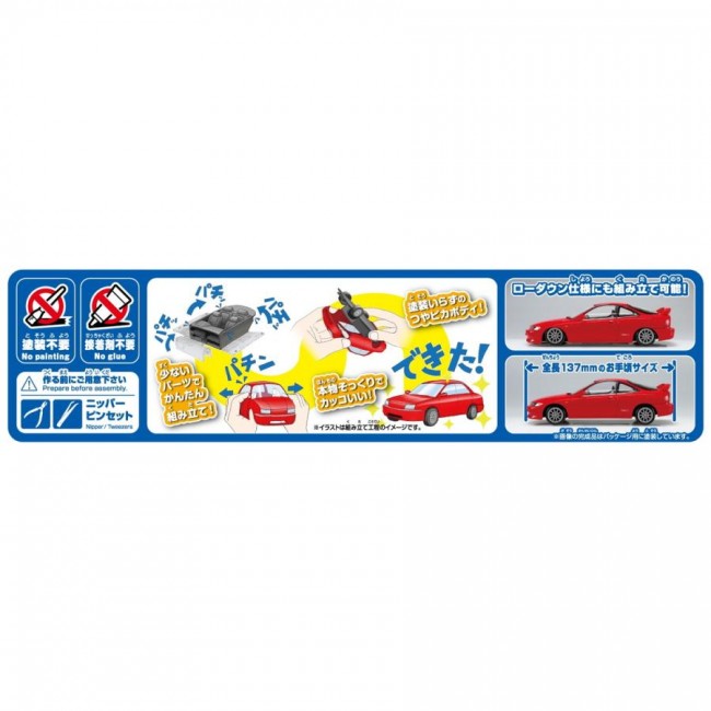 Plastic Model Kit [Scale] 1/32 Next R. 98 Spec now available. [Completely new mold] We have created a kit based on the late 1998 model of the Honda Integra Type R coupe, commonly known as the 98 Spec, which is a hot model equipped with VTEC. The number of parts has been reduced, and no painting or glue is required. This plastic model kit can be enjoyed by both children and adults. 【Product Features】 ? 28-part easy-to-assemble model ? 16-inch wheels ? Assembled even with a lowered suspension ? Painted areas are reproduced with stickers 【What is the Rakuraku Snap Kit?】 ? No painting required By reproducing the body color through the coloring of the plastic material, painting is no longer necessary. The glossy body is also a highlight. ? No glue required By adopting a snap-fit design, glue is no longer needed. ? High reproduction accuracy with fewer parts While simplifying the kit, it achieves high reproduction accuracy at 1/32 scale. ※This product is a plastic model kit. Tools are required for assembly.