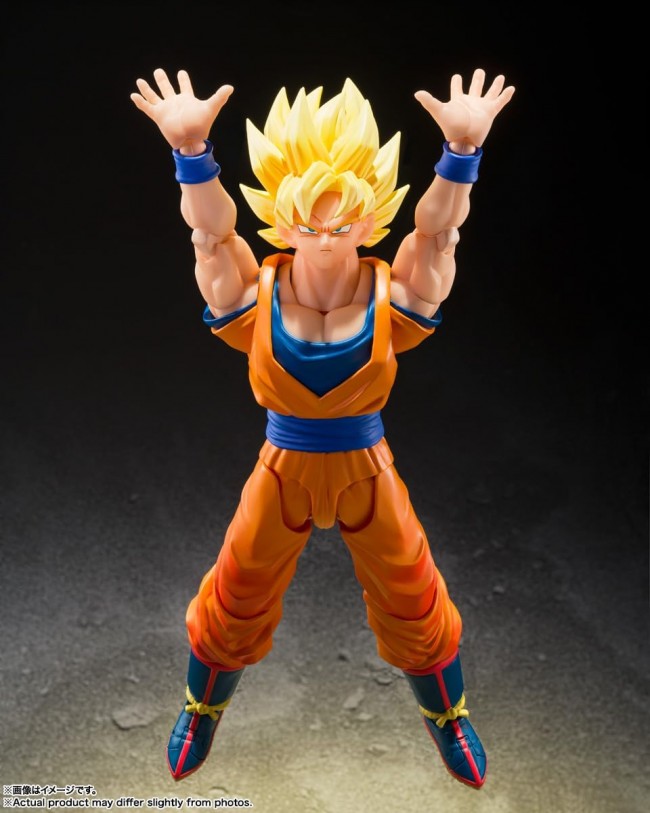 Action Figure (Completed Action Figure)  From “Dragon Ball Z” comes a newly sculpted S.H.Figuarts figure of “Super Saiyan Son Goku” wearing the costume from the Cell Arc!  The proportions, volume of hair, and facial expressions of the figure have been sculpted with attention to detail based on the anime drawings of the time, and are all completely new. The figure features a brushed-up version of the movable structure developed for the S.H.Figuarts Dragon Ball series!  Super Saiyan Son Goku is joining the S.H.Figuarts line with a completely new sculpt that features the latest in posability.  The figure's chest, shoulders, waist, and knees are all newly sculpted to achieve both appearance and mobility! In particular, the “Dynamic-Movable Shoulder System” (patent pending) has been adopted for the shoulders, allowing for more cool poses such as the Kamehameha wave to be recreated!  Three replaceable facial expressions are included: “Screaming”, “Clenching” and “Smiling”.  A replaceable head part with fluttering hair is also included, allowing you to recreate the intense battle scenes from the show!  Four replaceable wrist parts are included: “Open”, “Stance”, “Kamehameha” and “Instant Movement”.  Height Approximately 145mm  Material PVC, ABS  Set Contents Main body 4 replacement wrist parts (left and right) 3 replacement facial parts Interchangeable head parts  Series Name Dragon Ball Z  (c)Bird Studio/Shueisha/Toei Animation  Image shown is for illustrative purposes only. Please note that the product images and illustrations may differ from the actual product in some cases. Please note that products that have been on sale for a long time may no longer be produced or sold. Please note that product names, release dates, prices, and other information on this website is subject to change.  (From Bandai website)