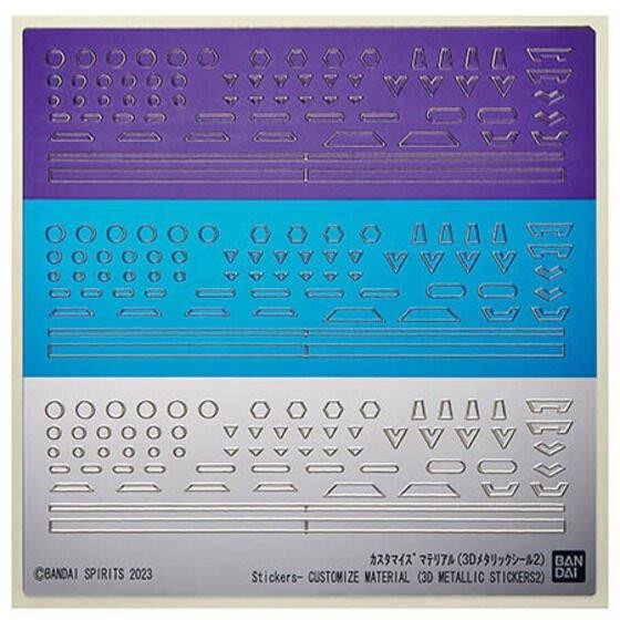 BANDAI SPIRITS official material parts brand "Customize Material"! The second volume of "3D Metallic Seal" is now available for the Customize Material series, which is ideal for 1/144 scale models and allows even beginners to easily increase the detail of their 1/144 scale models! A metallic layer is sandwiched between two plastic stickers to create a three-dimensional effect. Three colors are available: purple, blue and silver. Simply apply the stickers to add accents to the aircraft. Can be used to create luminous images of sensors, lenses, etc. [Included accessories] 3D metallic sticker x 1 Please note that the photos and illustrations of the products may differ from the actual products in some cases. Please note that some products that have been on the market for a long time may no longer be produced or sold. Please note that product names, specifications, release dates, prices, and other information on this web page are subject to change. The package, logo, and product specifications are subject to change without notice. (From Bandai website)