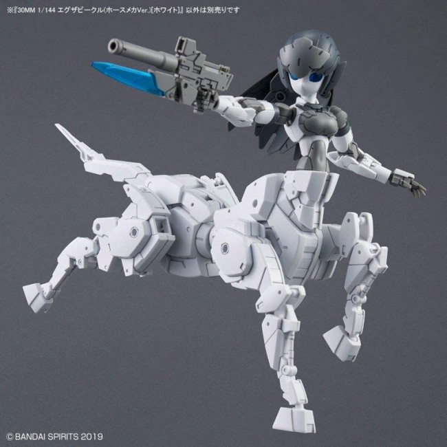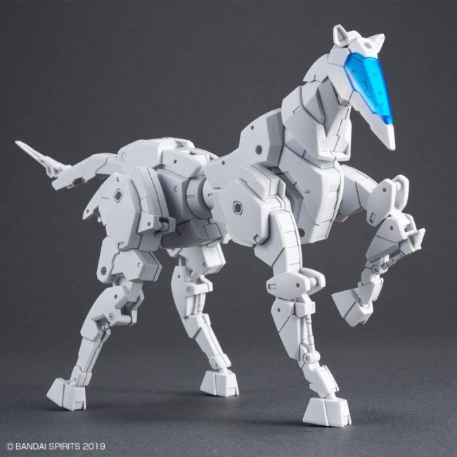 A new white version of the horse motif exa-vehicle “Horse Mecha” is now available! Each joint is flexible and movable from the head to the leg tips. Tail parts are foldable. Can be mounted on various aircraft (sold separately). By using the joint parts that come with items sold separately, such as [Customize Material (Pipe Parts/Multi-Joint)], you can fix the aircraft to be ridden and display. Joint parts are included for customizing with other aircraft sold separately, such as the “30MM 1/144 EXM-H15C Athelby (TYPE-C)”. Leg parts can also be used as leg parts of aircraft sold separately. [Accessories] Vehicle × 1 set Joint parts × 1 *Please note that some photos and illustrations of the product may differ from the actual product. *Please note that production and sales of products that have been on the market for some time may have been discontinued. *Please note that product names, specifications, release dates, prices, and other information on this web page are subject to change. *The package, logo, and product specifications are subject to change without notice. (From Bandai website)