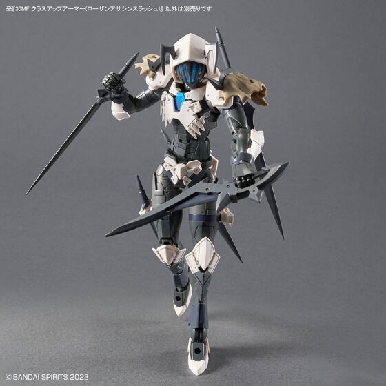 From “30 MINUTES FANTASY”, where you can create your own fantasy job, comes “Class Up Armor (Rosan Assassin Slash)”! This is a set of armor and armament that allows you to “class up” to a higher level job by upgrading to the “Armor Cross” (armor conversion). Can be combined with the “30MF Roseanne Assassin” (sold separately) to upgrade to the “Roseanne Assassin Slash” class. Includes two swords: a long sword and a short sword. The elemental core's attribute is water. Face design and coloring is different from the Liebel Republic's Assassin's Slash, which is sold separately. 【Accessories】 Long Sword × 1 Short Sword × 2 Armor parts × 1 set Armed parts × 1 set Joint parts × 1 set *Please note that some photos and illustrations of the product may differ from the actual product. *Please note that production and sales of products that have been on the market for some time may have been discontinued. *Please note that product names, specifications, release dates, prices, and other information on this web page are subject to change. *The package, logo, and product specifications are subject to change without notice. (From Bandai website)