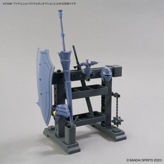 From “30 MINUTES FANTASY”, where you can create your own fantasy job, comes “30MF Item Shop 3 (Weapon Options)”! This set is packed with armaments and items that expand the range of “Armor Cross” [Armor Replacement]. Weapon Rack” can display various parts such as face, armor and armament, which are sold separately. The weapon rack can be combined up, down, left, right, front and back. Armed with a knife, scimitar, longsword and mace. Mace] can be transformed into [Horseman's Flail] by replacing the parts. [Accessories] Long Sword × 1 Scimitar × 1 Knife × 1 Mace × 1 set Weapon rack × 1 set Joint parts × 1 set *Please note that some of the photos and illustrations of the products may differ from the actual products. *Please note that production and sales of products that have been on the market for some time may have been discontinued. *Please note that product names, specifications, release dates, prices, and other information on this web page are subject to change. *The package, logo, and product specifications are subject to change without notice. (From Bandai website)
