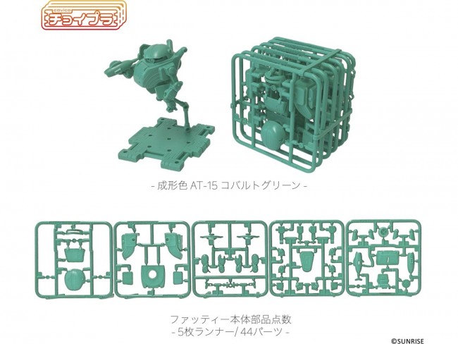 Choipla Fatty ・Product Specifications: Injection Plastic Kit ・Snap-fit assembly ・Material: PS ・Number of Parts: 44 parts (5 runners) ・Molded Color: AT-15 Cobalt Green ・Includes display base: 1 runner (8 parts) ・Non-scale ・Size: Approx. 47mm (head height)