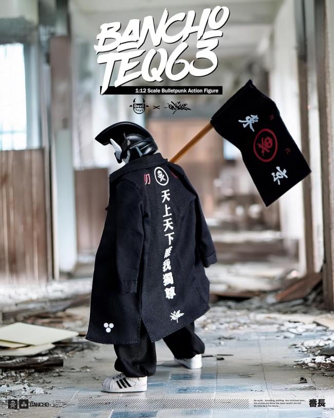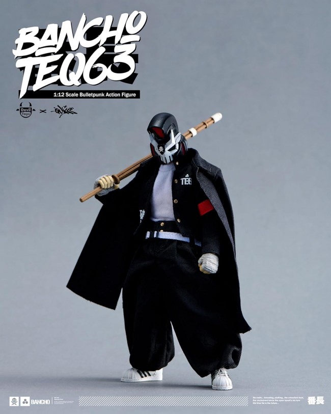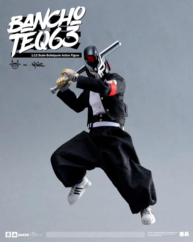 The Legend Returns! The cult-favorite overseas soft vinyl delinquent dropout “BANCHO” TEQ63 is finally back in a 1:12 scale Bulletpunk Universe version! This figure features multiple points of articulation for dynamic posing. It also comes with interchangeable parts and accessories. Add it to your collection today! ★: About “TEQ63”: TEQ63 is a character created by Filipino designer Quiccs, blending cyberpunk and street culture. Due to its popularity, Hong Kong toy manufacturer Devil Toys took charge of production and began collaborations with various artists and themes. ★: About “BANCHO” TEQ63: Devil Toys' “BANCHO TEQ63” series is a collaboration line based on Quiccs' popular character “TEQ63,” themed around Japanese delinquent culture (Bancho style). 【1:12 Bancho TEQ63】 Product Name Devil Toys x Quiccs Bulletpunk Universe Set Contents: BANCHO TEQ63 Figure Interchangeable Hand Parts ×4 Baseball Bat (Red) Baseball Bat (Silver) Bamboo Sword Part Flag Parts ×2 Spray Can Parts ×2 Size Total Height: Approx. 160mm Materials ABS, PVC, POM, Polyester Prototype Production Devil Toys @ Devil Toys 2023. All Rights Reserved