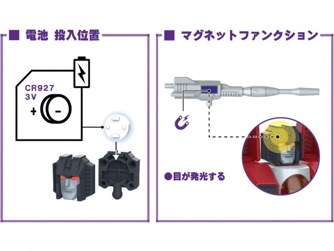 From the “Transformers” series comes “Starscream”! He is known as a Decepticon soldier who combines speed. The kit includes a body, 3 face parts, 2 laser guns, 2 missile parts, 2 flight effect parts, and 1 pedestal for detailed posing! In addition, the eyes glow red with a light-emitting gimmick using magnetic function! Body length: 190mm Fully painted (with damage paint) Light-emitting gimmick for eyes (3 different ways of glowing) Battery for head (eyes): CR927 3V x 1 *battery sold separately Laser gun with magnets inside. Partially die-cast No adhesive or tools required *The product is a non-deformation model.