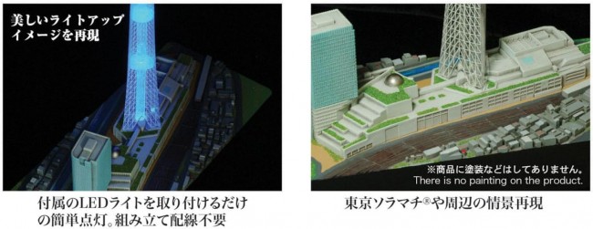 Plastic model [Scale] 1/3000 [Size] 234×180×100mm [Others] 1 LED light (blue), trial button battery included The plastic model of Tokyo's symbol “Tokyo Sky Tree(R)” is renewed! Scale 1/3000, precision plastic model. Tokyo Skytree Town(R) (sold separately) is also modeled together, and the Skytree(R) itself is clear-molded. The truss pattern is reproduced by tampo printing, and the kit can be lit up by the included LEDs. The kit is a snap-together, no glue required, and the LEDs are blue in color, in keeping with the spirit of the real Skytree! Paint the Tokyo Skytree Town for a more authentic scenic model! *Trial button batteries are included.