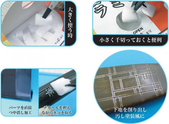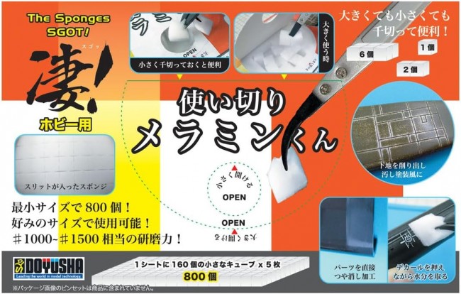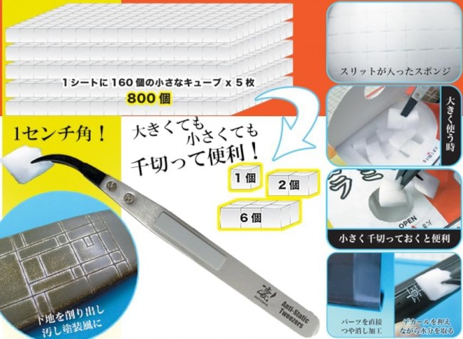 Press down on decals while removing moisture, or recreate weathered paintwork with light sanding! Introducing our new disposable melamine sponge! This slit-patterned sponge transforms into 160 cubes when separated. Separate them individually, or adjust the size to 2-6 cubes depending on your needs! Separating them makes grabbing cubes from the top dispenser slot quick and easy! ■1 sheet (160 cubes) × 5 sheets ■Sheet size: 100×160×10mm