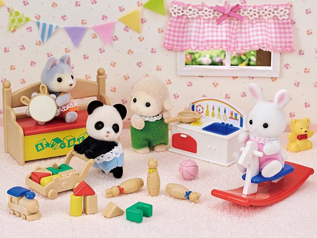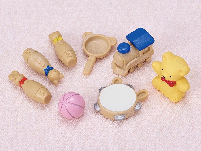 Since its launch in 1985, the Sylvanian Families have been widely loved by children and adults as "toys that nurture the heart and create dreams and happiness." A set of white rabbit baby Sophie, panda baby (yes yes) Roy, and colorful toys. There are lots of baby toys such as playhouses and bowling. As it is an all-in-one set, you can enjoy playing with this product alone. [Set contents] Baby white rabbit, baby panda (yes), bench, mokuba, playhouse kitchen, frying pan, blocks (triangle / red), blocks (triangle / brown), Tsumiki (cylinder), Tsumiki (square pillar), Tsumiki (arch), Tsumiki cart, plush toy, train, boring pin (rabbit), boring pin (cat), boring pin (bear), ball, tambourine (C) EPOCH