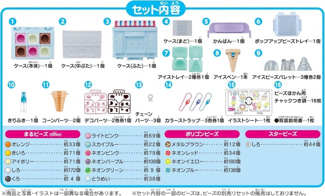 Aqua Beads are mysterious beads that stick together with water! Let's draw pictures with colorful beads! ●This set allows you to create sweets and three-dimensional ice cream creations. It comes with special tools (case, tray, pen, and spray bottle), so you can start playing right away. ●You can easily create three-dimensional ice cream creations using the ice cream tray. You can decorate your creations using decorative parts that stick together with water. ●The convenient ice cream pen allows you to switch between three types of ice cream bead palettes. ●The ice cream shop-shaped case can be used to display your creations or store your tools. ●Your favorite creations can be attached to a bag as a keychain. When you attach a 3D ice cream to a keychain, the beads inside the cone part rattle around. 【Set Contents】 ? Round beads, polygon beads, star beads?total of 16 types, approximately 1,000 pieces ? Case, signboard, ice cream bead palettes ×6 (round/bear/soft serve ×2 each), pop-up bead tray, ice cream trays ×2 (round/soft serve ×1 each), ice cream pen, spray bottle, decorative parts ×2 (light pink/dark brown ×1 each), Cone parts ×2, chain parts ×3, color straps (neon red/neon purple/neon blue ×1 each), zippered bags for beads ×16, illustration sheet ×1 (2 types) (C) EPOCH