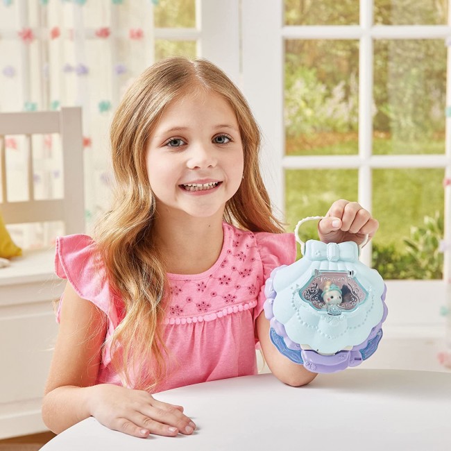 The set includes a shell-shaped store, sea-themed accessory accessories and a baby silk cat. The accessories can be displayed in the store or worn by the baby. When the store is closed, it becomes a shell bag. The bag can be adorned with a cute baby and carried around. Silk cat baby, tiara, walking stick, pochette Body (lid), body (base), signboard Brush, compact, stuffed animal Cash register, sofa, cash register stand, Dream No., bag (crab) bag (shellfish), catsuit, balloon (octopus), balloon (blowfish) (C) EPOCH