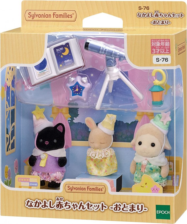 Action Doll (complete with clothes) Nakayoshi Baby Set -Otomari- [Hoikuen Series [Hoikuen Series] A set of three babies with the theme of Otomari-kai, perfect for Hoikuen. You can enjoy the scene of stargazing at Otomari-kai. You can observe the starry sky with an astronomical telescope and a constellation book. Babies wear cute pajamas with star patterns and night caps. Lanterns can be held in baby's hands. HoshiZora Cat's baby's name is Gloria, Sheep's baby's name is Emma, and Miruku Rabbit's little baby's name is Iris. Minna no Ohisama Hoikuen" (sold separately), "Let's Play! Minna no Hoikuen Bus," "Nakayoshi Swing Set," "Castle Osunaba/Pool Set," and "Flora Rabbit Family," all sold separately, for more fun play. Can be played with babies sold separately or with small babies. Hoshizora Neko Baby (Girl): Gloria Midnight Birthday: June 11 / Favorite thing to do: Hide and seek Baby sheep (girl): Emma Dale Birthday: February 16 / Likes: apples, cream puffs, balloon rides Small baby Miruku rabbit (girl): Iris Perrywinkle Birthday: October 25 / Favorite things: Napping in the bath Set includes. Hoshizora Cat Baby, Sheep Baby, Miruku Rabbit Little Baby, Astronomical Telescope, Constellation Book, Star Clock, Lantern *Some specifications may differ between the product and the photo. Photos shown may include images. (From Epoch website)