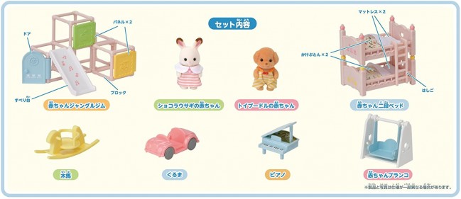 The babies are wearing original clothes only for this set. 6 types of furniture are in pastel colors