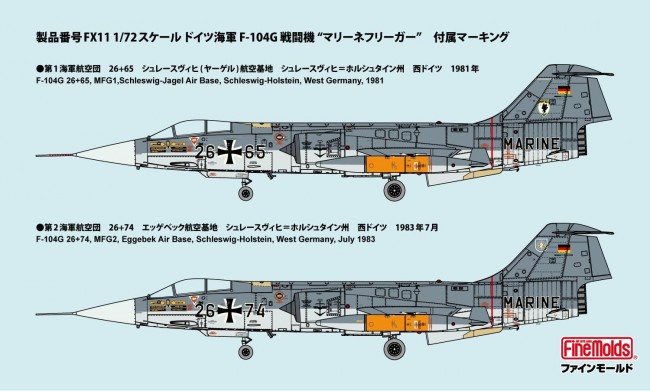 German Navy F-104G Fighter “Marineflieger” When it comes to naval aviation, the Japan Maritime Self-Defense Force primarily operates anti-submarine patrol aircraft and ship-based anti-submarine helicopters, while countries like the United States and France, which possess aircraft carriers, are strongly associated with the operation of carrier-based aircraft. However, there are many countries around the world where navies independently operate land-based fighters as anti-ship attack aircraft. The German Navy’s Marineflieger (Naval Air Force) operated supersonic jet fighters in a role similar to that of the Imperial Japanese Navy’s Type 1 Land-Based Attack Aircraft. The West German Navy valued the F-104G not for its handling difficulties?which had been exposed in the Air Force?but rather for its stability against gusts due to high wing loading, its high speed of Mach 1.15 at sea level, and its low detectability due to its small size. Designed to excel at low-altitude, high-speed flight, it was deployed to launch high-speed attacks from low altitudes?below enemy radar coverage?while carrying anti-ship missiles, and exerted significant influence in the Baltic and North Sea regions, which were the front lines against the Soviet Union at the time. To accurately reproduce this F-104G adopted by the West German Navy, this kit features newly molded parts for the engine nozzles, navigation lights, and Mk.GQ7 ejection seat, in addition to the chaff and flare dispensers. Markings for aircraft belonging to the 1st Naval Air Wing (MFG1) and the 2nd Naval Air Wing (MFG2) are included. Series Name 1/72 Scale Jet Aircraft (Limited Edition)