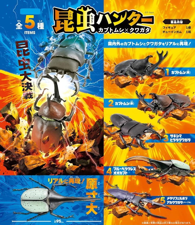 Realistic reproductions of domestic and foreign beetles and stag beetles! 1: Beetle (Black) 2: Beetle (Red) 3: Saxima Flatback Stag Beetle 4: Blue Hercules Beetle 5: Metaliferous Stag Beetle (Purple) Realistically reproduced! Full-size content product figure 1 piece of chewing gum 1 box with all 5 types.