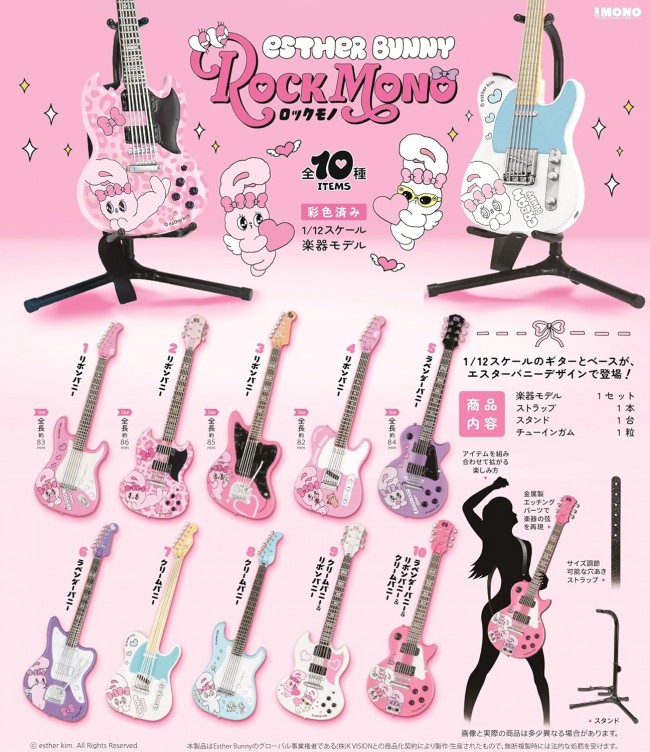 1/12 scale Kitaro and bass guitars debut in Esther Bunny design! ● Expand your enjoyment by combining items ● Metal etching parts recreate instrument strings ● Adjustable strap with holes Contents: 1 instrument model set 1 strap 1 stand 1 piece of chewing gum Lineup: 1: Ribbon Bunny 2: Ribbon Bunny 3: Ribbon Bunny 4: Ribbon Bunny 5: Lavender Bunny 6: Lavender Bunny 7: Cream Bunny 8: Cream Bunny 9: Cream Bunny & Ribbon Bunny 10: Lavender Bunny & Ribbon Bunny & Cream Bunny *One box contains all 10 types (C) esther kim. All Rights Reserved