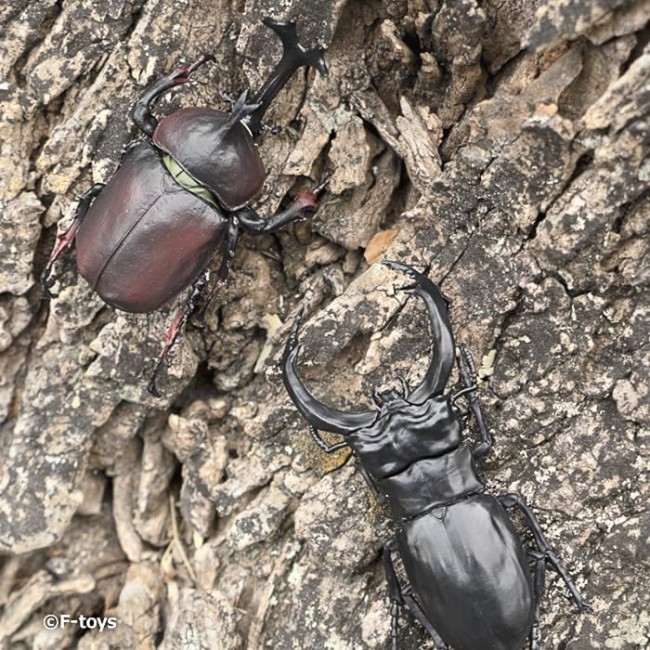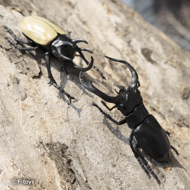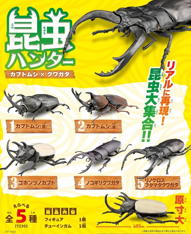 Realistically recreated! Insect Extravaganza!! 1: Rhinoceros Beetle (Black) 2: Rhinoceros Beetle (Red) 3: Longhorned Beetle 4: Sawtoothed Stag Beetle 5: Two-horned Stag Beetle Contents 1 Figure 1 Piece of Chewing Gum *1 BOX contains all 5 types × 2 sets. (C)F-toys