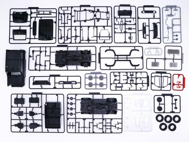 Following Green and Yellow, Blueish Black Pearl 3 arrives for the Jimny Sierra in the Car NEXT series! (Product Features) ・The product is modeled after the JC grade of the JB74W-1 to 2 type released in 2018. ・The JC grade features exclusive aluminum wheels and mirrors with turn signals. ・The 1/24 scale allows for accurate reproduction of details. (Structure/Specifications) ・Composed of color-separated parts, the desired coloring can be reproduced without painting. ・Snap-fit assembly allows for construction without glue. ・Composed of 7 molded colors. (Gloss Black, Flat Black, Silver, Gun Metallic, Clear Smoke, Clear, Clear Red) ・Even with straight assembly, colored parts create a painted-like visual effect ・Parts division significantly reduces masking work even when painting Body ・Part colors use specialized molding materials to reproduce a gloss level difficult to achieve with painting ・Body and roof are separate parts, molded in Gloss Black. ・Body features a box shape achieved via slide mold, accurately reproducing the square style ・The overfenders, a signature feature of the Jimny Sierra, are separate parts ・Features the standard Car NEXT series construction: layered insertion of parts like the hood, rear, and roof into the body ・Concave molds like door panels are expressed with pronounced depth to accommodate paint detailing ・The overfenders are integrated with the side under garnish and molded in flat black. ・Wider, dedicated front and rear bumpers are included compared to the Jimny (JB64). Underfloor ・The underbody features a ladder frame section as a separate part, with attached components added to it. ・Leading arms, trailing arms, front/rear differential gear cases, and driveshafts are modeled as separate parts ・Trailing arms include dedicated parts for the Jimny Sierra ・Suspension geometry modeled after the 4AT variant Windows ・Driver/passenger windows feature separate glass and frame designs, eliminating the need for seal painting or masking during painting ・Rear windows (side/rear) feature dedicated smoke-colored molding to express color difference from front windows ・Rear window defogger is expressed with delicate engraving ・Wiper arms/blades are finely molded parts with realistic thinness; concave shapes on blade surfaces are also expressed with detailed engraving Interior ・The steering wheel is a dedicated part reproducing the JC's distinctive features. ・Cruise control and audio switches on the steering wheel are expressed with delicate engraving. ・Seats feature a two-piece construction to reproduce both the seat cushion and backrest shapes. ・The rear seat backrest pattern is engraved, and the headrests reproduce the lowered position. ・The rear luggage box lid reproduces the split pattern. Equipment ・Headlights feature a dedicated part replicating the LED light shape exclusive to the JC grade ・Side mirrors reproduce the JC-specific design with integrated turn signals ・Features JC-grade exclusive aluminum wheels, realistically reproduced in gunmetal molded color ・Tires are molded rubber resin parts using dedicated molds; includes 195/80R15 on-road tires ・Rear spare tire uses the same rubber material as the four wheels ・Rear lights use layered clear red and clear molded color parts to recreate the two-tone light lens ・Lights feature finely sculpted details like the reflector's curved surface and bulb Decal Sheets ・Included decals reproduce detailed coloring; pre-cut for easy application ・Decals include the meter panel, logos, vehicle numbers, etc. ・Display monitor decals include both lit and unlit states to recreate your preferred scene. ・Mirror sections can be realistically reproduced by applying mirror decals. ・Includes “4WD” and “Jimny” decals for the spare tire half cover. ・Completed size: (approx.) Length 150 x Width 79 x Height 76 mm 【Contents】 ・Runners x17 ・Rubber tires x5 ・Assembly instructions x1 ・Decals x2 ※Contents as of November 2025. Please note that monitor and image resolution differences may cause colors to appear different from the actual product. (From the Fujimi Models website)