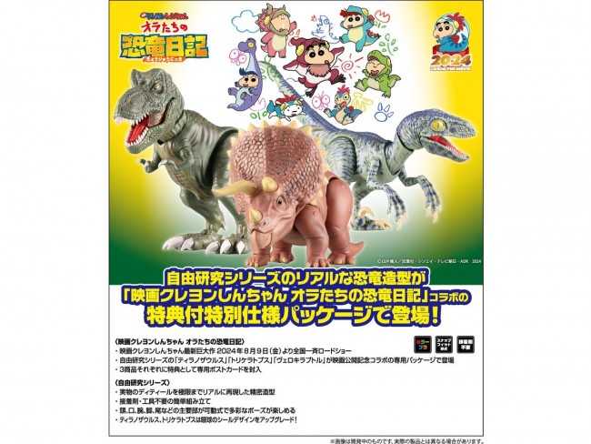 Realistic dinosaur sculptures from the Jiyu Kenkyu series are now available in a special edition package with special offers in collaboration with the movie “Ora-tachi no Dinosaur Nikki” (Diary of Ora's Dinosaurs)! Crayon Shin-chan's latest giant movie will be released on August 9, 2024 (Fri.) on a nationwide roadshow. Triceratops” from the Jiyu Kenkyu series is now available in a special package in collaboration with the movie release. An exclusive postcard is enclosed as a bonus. The figure is a precision molding that reproduces the details of the real thing to the utmost limit of realism. The head, mouth, arms, legs, tail, and other major parts of the figure are movable, allowing the figure to be posed in a variety of ways. Easy assembly with no glue or tools required. Please note that colors may look different from the actual product due to monitor and image resolution issues. (From Fujimi Models website)