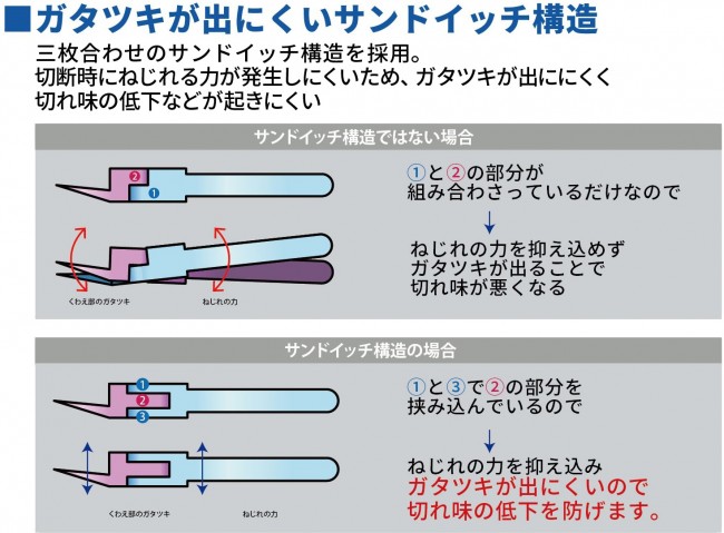 Since there is no groove in the grip, it is difficult to damage what you have grasped. The taper allows you to grab and bend small parts that are difficult to hold by hand. [Craft Grip Series] Durable and easy-to-use series with sandwich structure for high durability and easy-to-grip grip Introducing the features of the Craft Grip series! ■ Easy to grip The Elastrima grip makes it easy to grip and apply force, and the grip shape that follows the hand is thick and does not make your hands tired. ■ Sandwich structure that does not easily rattle Adopted a sandwich structure of three pieces. Since twisting force is less likely to occur during cutting, rattling is less likely to occur and sharpness is less likely to deteriorate. (?) Why should there be rattling? If there is rattling, it will not be possible to pinch the object well. If the rattling is too severe, the grip may slip sideways when you grab an object, or the force may not be transmitted accurately to the tip.