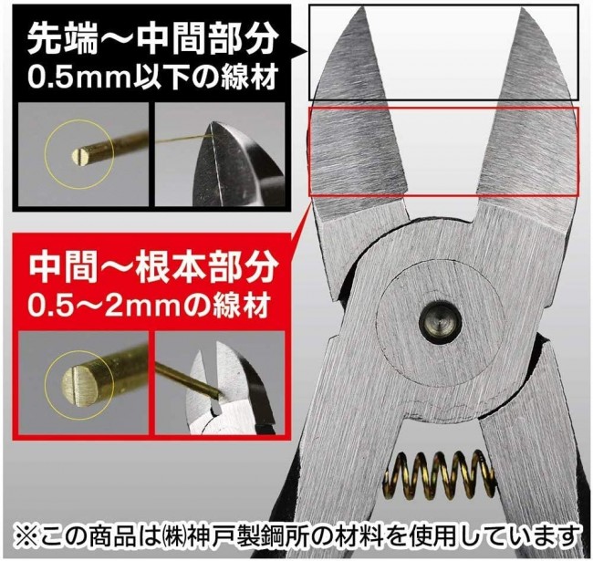 [Size] Overall length: Approximately 130 mm Metal wire dedicated nippers that support metal wires from 0.042 mm to 2 mm! !! ・ A double-edged nipper dedicated to metal wires that focuses on Φ2 mm brass wires from the metal lines used in model making. It is possible to cut with a "flat cross section" instead of the "crushed cross section" that is often found in general metal wire nippers! This one can be widely used for metal wires used in models. ・ Beautiful cross section ・ Short finishing time Since it is cut without crushing it as flat as possible, it crushes and swells, and the shaft diameter etc. does not change. ・ By applying a special blade, it can be used for all sizes. It can also be used for cutting metal wires of various sizes, from 0.02 (0.042 mm) metal wires to Φ2 mm brass wires! ■ Product description ・ Adopts God Hand's original blade attachment technology "Hybrid Edge". The blade attachment is different between the tip side half and the root side half when viewed from the center of the blade, and this one can handle from ultra-fine wire to 2 mm wire. Specializing in wire cutting from 0.5 mm or less on the tip side and 0.5 mm to 2 mm on the root side ・ Blade so that the cut surface of the target wire is as flat as possible. ・ It is possible to cut with a light force compared to nippers of the same size (compared to God Hand). ・ Handmade one by one by a veteran blade sharpener ■ Quality notation ・ Double-edged nippers for metal wires ・ With spring ・ Overall length: Approximately 130mm ・ Soft grip ・ Blade hardness: HRC56 or higher ・ With cap ■ Maintenance ・ If you touch a metal part with your finger, wipe off your fingerprints and apply oil. Sebum can cause rust, so be sure to wipe it off with a clean cloth. ・ Regularly add rust preventive and lubricating oil such as nipper maintenance oil. If the lubrication performance deteriorates, rattling will occur and it may cause damage. ・ After use, attach a cap and store. ■ Notes ・ Do not cut anything other than the target wire. ・ For safety, please wear protective goggles. ・ Because the object may fly, make sure that there are no people around and that there are no fragile objects before starting work. ・ Do not touch the cutting edge directly. ・ Do not apply more load than the capacity. Pay particular attention to the load on the tip. ・ To prevent rust, wipe off dirt and fingerprints, and lubricate the shaft and cutting edge. ・ Store in a case out of the reach of small children.